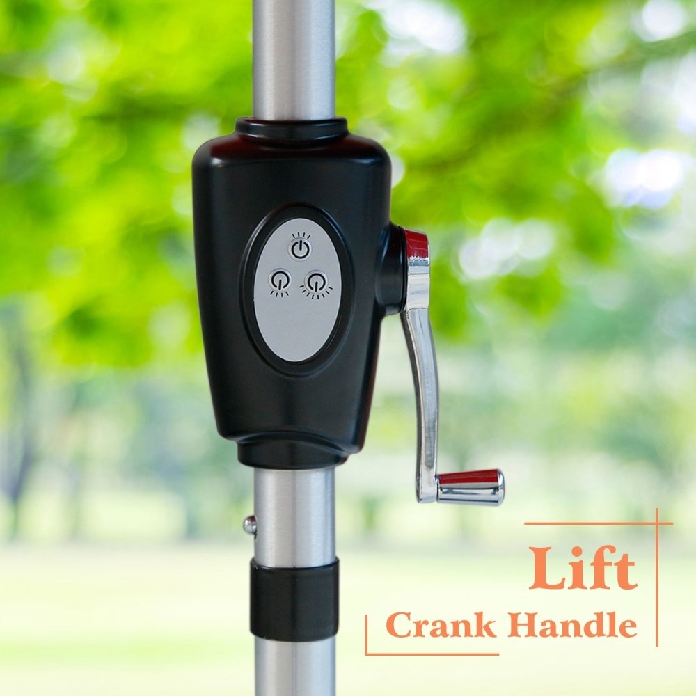 Description:Product Material:Made of update spun poly waterproof fabric, block up to 99% of harmful UV rays. Anti rust 1.5 inches diameter aluminum pole with 8 steel ribs for superior strength support.Product Design:Solar-powered lights provide energy-efficient lighting, enough light source that last for 9-12 hours. The easy push-button tilt system adjustable range is up to to 45° that gives more angles of coverage while the wind vent under the umbrella cools air to stay cool at all day. Provides maximize shade area on hot summer days for your outdoor settings.