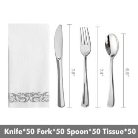 50pcs Gold/Silver Disposable Forks Plastic Tableware Dessert Knives Forks Spoon Cutlery Set Wedding Birthday Party Decor Supply (Color: Silver set)